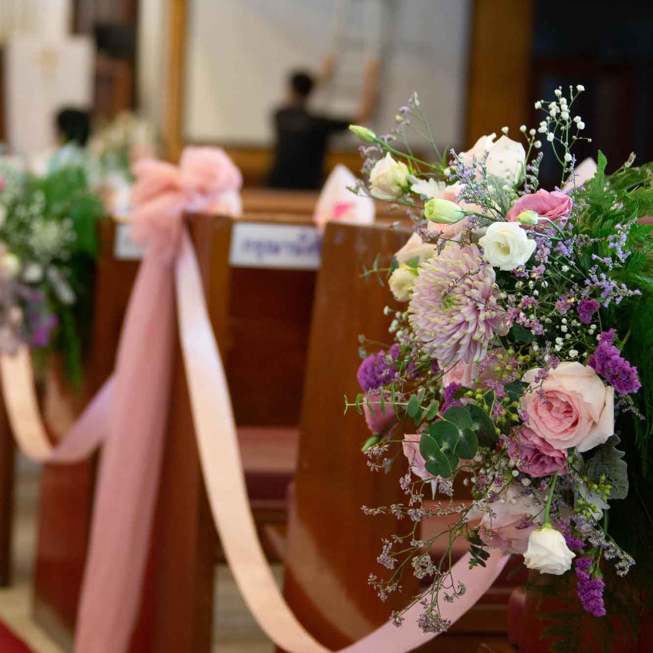 - Kirchenbänke / Stuhlschmuck mit Schleifen & Blüten
